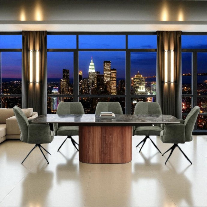 Introduce modern sophistication to your dining space with the AURELIA WITH SPIDER LEGS & VENEZIA CHAIRS GREEN DINING SET , featuring the sleek AURELIA WITH SPIDER LEGS & VENEZIA CHAIRS GREEN DINING SET and stylish Tulip Chairs. The table boasts a stunning black marble top with natural veining, elegantly supported by a ribbed wooden pedestal base that exudes contemporary charm. Complementing it, the Tulip Chairs are upholstered in plush green velvet with a curved, ergonomic design, swivel functionality, and black metal legs for a perfect blend of comfort and style. Ideal for family gatherings, upscale dining, or statement interiors, this set redefines luxury dining with its bold yet timeless aesthetic.