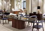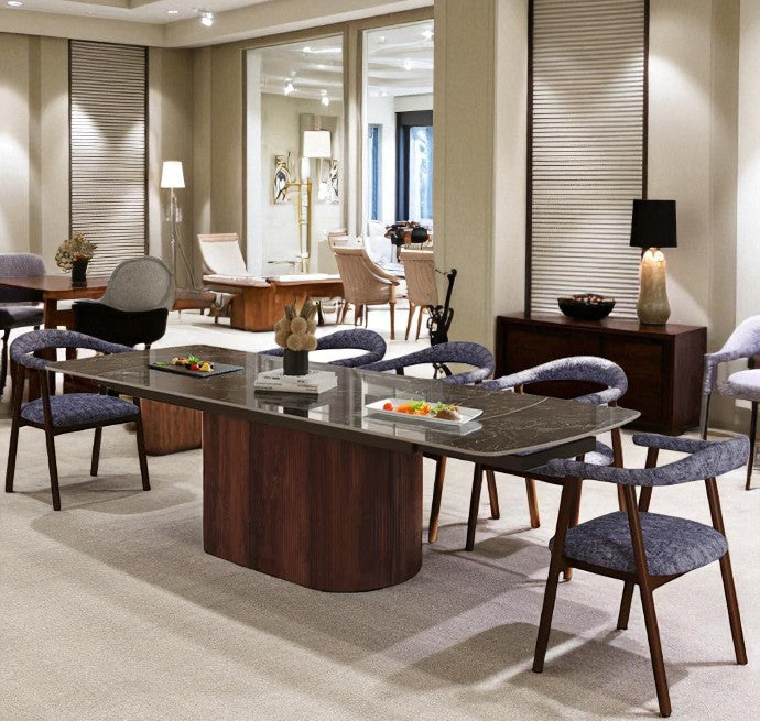 Upgrade your dining experience with the AURELIA WITH PEDESTIL LEGS BLACK WITH 6 TORINO BLACK CHAIRS DINING SET a perfect fusion of modern sophistication and timeless elegance. Featuring a luxurious black marble-finish tabletop and a rich wooden pedestal base, the Urban Imani table brings both style and durability to your space. Paired with six sleek Hendrix chairs, upholstered in plush blue fabric with a curved ergonomic design, this set ensures both comfort and aesthetic appeal. Ideal for contemporary dining spaces, the Urban Imani & Hendrix set makes every meal a refined experience.