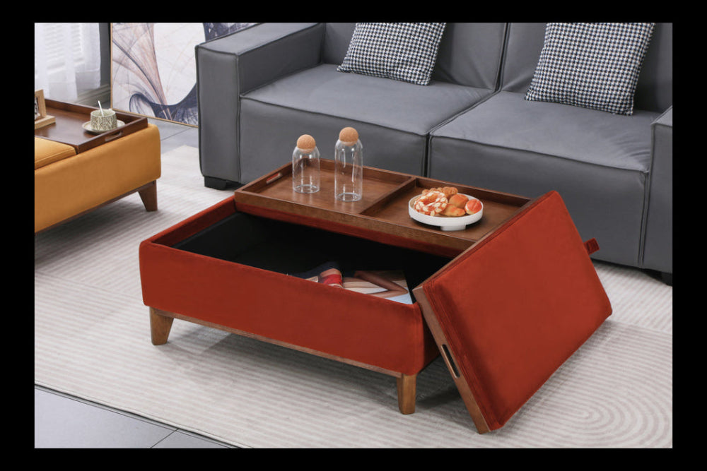 The PARMA OTTOMAN COFFEE TABLE LARGE BURNT ORANGE & GREY is a functional and stylish addition to any modern living room. Combining sleek design with practicality, it features a dual-purpose top that can be lifted to reveal hidden storage, ideal for keeping your space tidy and organized. The top also includes a removable wooden tray for serving drinks, snacks, or displaying decor. Its plush upholstered finish ensures comfort and elegance, while the sturdy wooden legs add durability and stability. Perfect for compact spaces, this ottoman coffee table is a stylish blend of storage, functionality, and contemporary design.